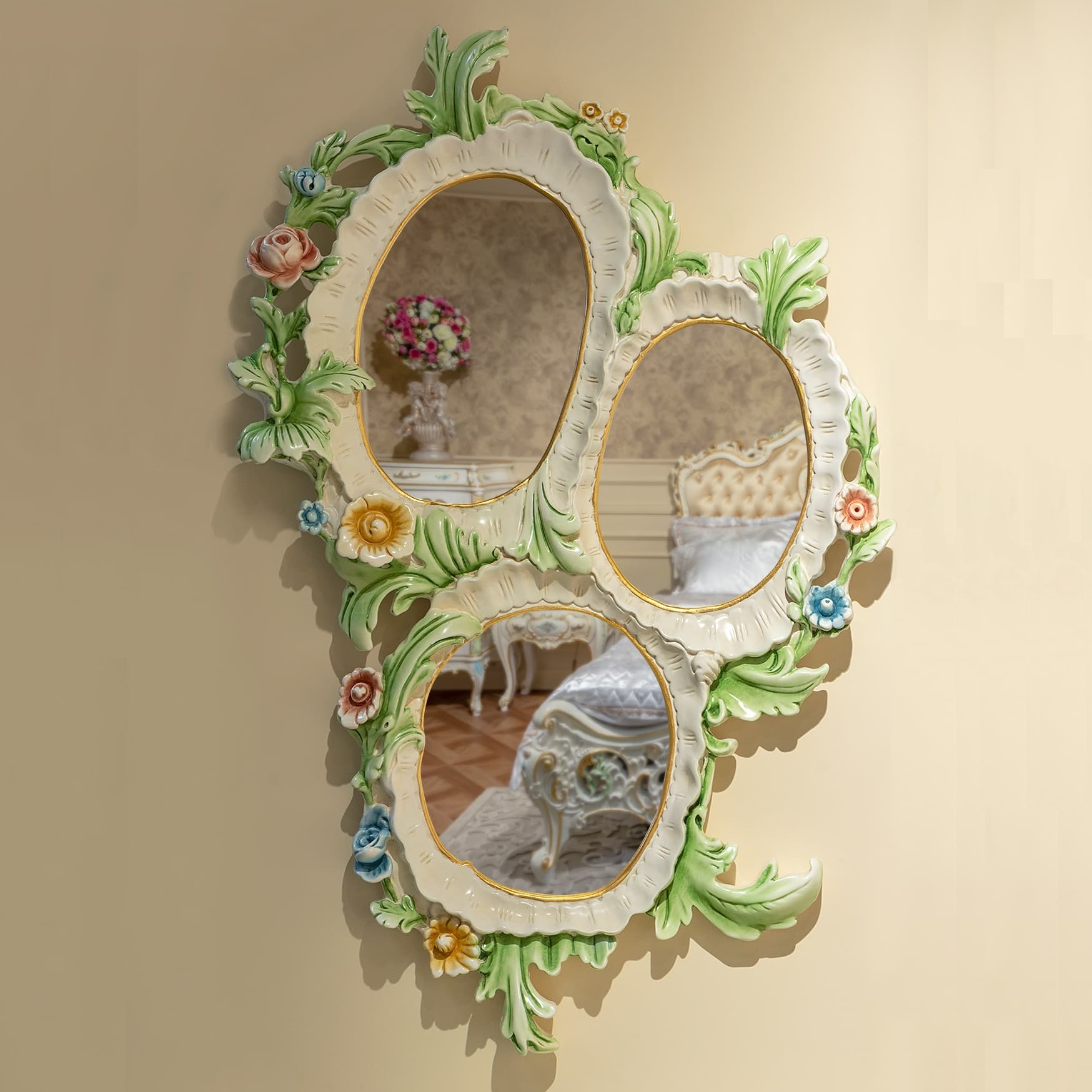 При декорировании мебели применяются вставки из ценных древесных пород, а также драгоценных камней. Деревянные диваны также дорабатываются ручной резьбой или вставками из меха. Допускается матирование, крашение, лакирование, старение. Материалы безопасны для человека, что подтверждается специальными сертификатами.